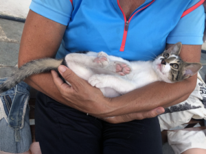 Dit prachtige mannetje is op zoek naar een eigen huisje. Nu hij een tijdje in een opvanggezin heeft gezeten is Igelito veranderd van een mannetje dat bang was voor mensen, naar een heerlijk kereltje die nu dol is op iedereen. Het is een ontzettend lief mannetje, 100 % gericht op mensen en dol op knuffels. Hij wil graag spelen en knuffelen en is lief voor alle andere katten. Igelito kan geplaatst worden bij kinderen van alle leeftijden en dus ook met andere katten. Honden is hij niet gewend, maar het lijkt me geen probleem als er een lieve hond aanwezig is. Kleine Igelito is op straat geboren, zijn moeder had beschutting gezocht in een leegstaand huis. Toen hij en zijn broertje en zusjes ongeveer een maand of twee waren kwam de huiseigenaar thuis en heeft mama haar kleintjes mee genomen naar de straat. Ze werden gelukkig wel gevoerd door buurtbewoners en toeristen. Maar kleine Igelito was heel bang voor al die mensen en verstopte zich in de tuin van Katerina. Zij heeft hem liefdevol in de opvang genomen. Inmiddels heeft hij een vriendinnetje gevonden in Rosie. Hij zou heel graag samen met haar naar worden geadopteerd. Hoe hij aan zijn naam komt? Tja dat is wel een bijzonder verhaal. Hij was zo bang voor alles en iedereen dat hij de eerste dagen, als hij niet verstopt zat, dicht tegen de muren aanliep, zijn rug hoog en ook zijn haar overeind. Een klein egeltje en dat is dan ook wat igel ( Duits voor egel) betekent. Igelito dus, klein egeltje. Bent u op zoek naar een lief klein huisgenootje, die heel veel liefde te geven heeft? Neem dan snel contact met ons op, binnenkort zal hij dan naar Nederland kunnen komen. Klik hier voor een filmpje.